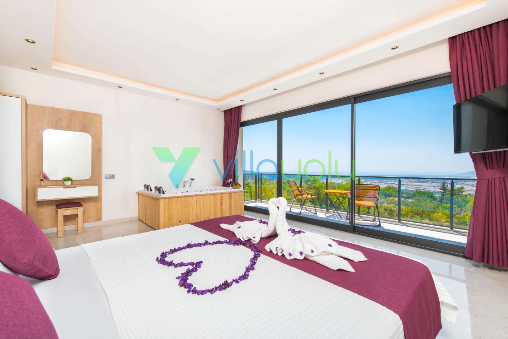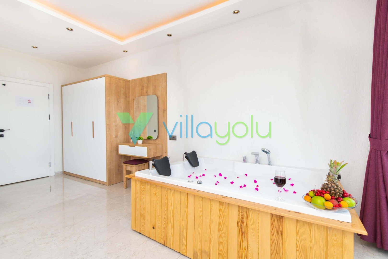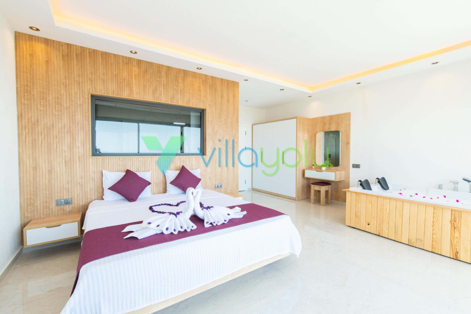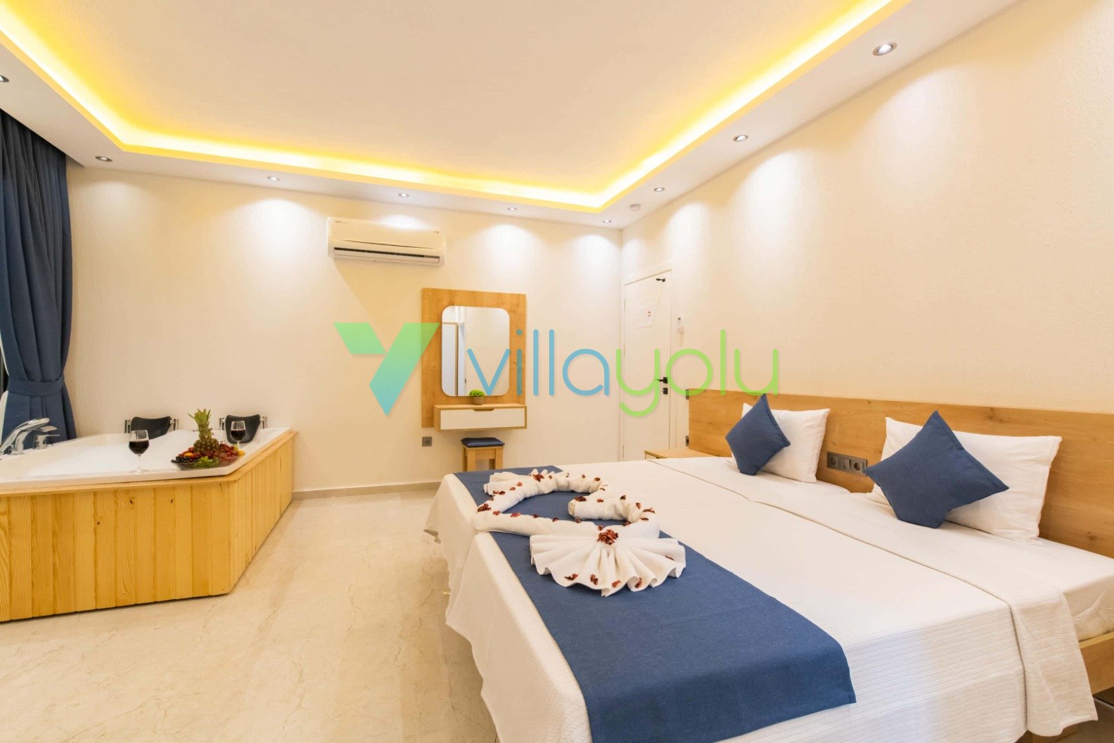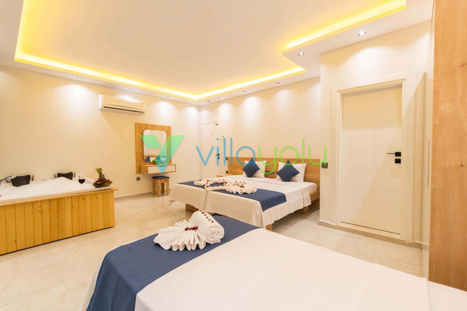 1. Yatak Odası (Aile): Çift kişilik yatak, Klima, TV, Elbise Dolabı, Makyaj Masası, Jakuzi, Banyo/WC.