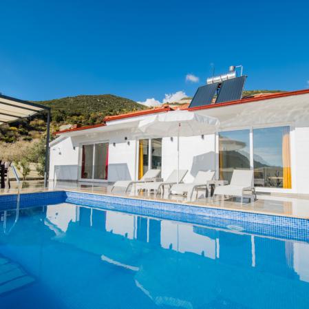 Villa Ahu,Kalkan Sarıbelen bölgesinde 2 yatak odası 4 kişi kapasiteli geniş bahçeli ve havuz alanı korunaklı tatil villasıdır.