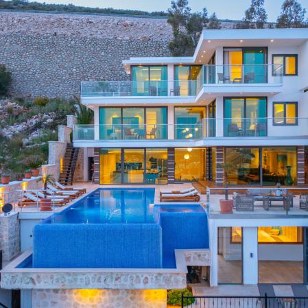 Kalkan Merkez'de bulunan Villa Aslan harika deniz manzarasına sahip 4 yatak odası 8 kişilik kapasiteli ultra lüks bir villadır.Hamam,jakuzi ve saunası olan villamızın çocuk havuzuda bulunmaktadır.Modern,kaliteli ve lüks eşyalarla döşenen villamız konum itibariyle tüm olanaklara yakın konumdadır.