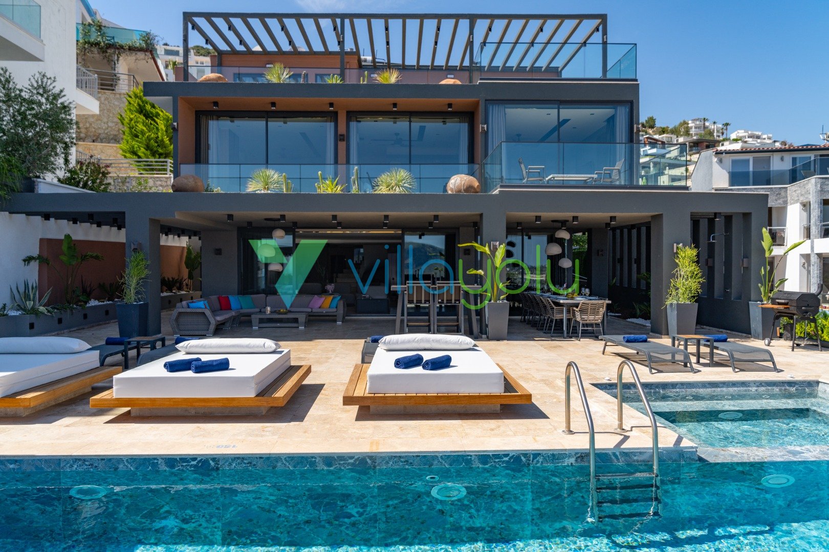 Harika sonsuzluk havuzuna sahip Villa Buse Duo geniş yaşam alanı,modern dizaynı ve konforlu odaları ile sizlere eşsiz bir tatil deneyimi sunmaktadır.Tamamı deniz manzarasına hakim 5 yatak odası bulunan Villa Buse Duo kalabalık aileler ve arkadaş gruplarının birlikte keyifli vakit geçirmesi için son derece modern ve lüks şekilde dizayn edilmiştir.