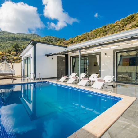 Villa Ceylan,Kalkan Sarıbelen'de 2 yatak odası 4 kişi kapasiteli havuz alanı korunaklı doğa ve dağ manzaralı kiralık tatil villasıdır.Villa modern ve şık bir tasarıma sahip olup Kalkan merkeze 12km uzaklıktadır.