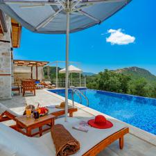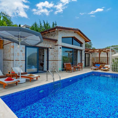 Kalkan'ın en yeşil köylerinden Üzümlü'de bulunan villamız uzaktan Patara plajı manzaralıdır.Doğa içerisinde ve ferah bir konumda bulunan villamız geniş bahçe ve havuza sahiptir.2 yatak odası - 4 kişilik kapasitesili villamız havuzunın etrafı korunaklı olması sebebiyle muhafazakar aileler için uygundur.