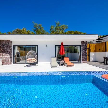 Villa Kumru, Kalkan İslamlar'da 2021 yapımı havuz alanı korunaklı,jakuzili 2 yatak odası 4 kişi kapasiteli tatil villasıdır.