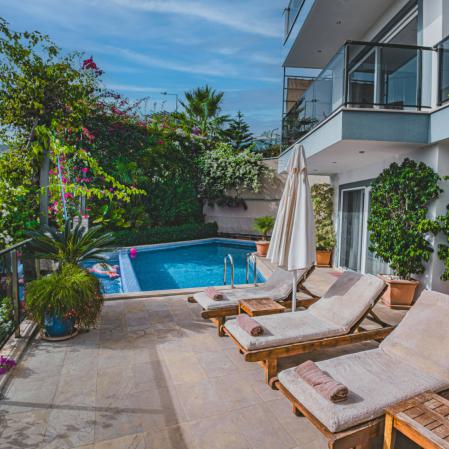 Villa Melisay, Kalkan Kızıltaş mevkisinde deniz manzaralı havuz alanı korunaklı 3 yatak odası 6 kişi kapasiteli özel havuzlu tatil villamızdır.Perde sistemi ile havuz alanı korunaklı getirilen villamızda, istendiği takdirde perde açılarak havuz alanı ferah bir manzaraya kavuşmaktadır.
