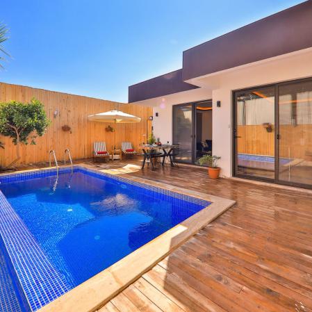 Villa Portakal Çiçeği-1 Kalkan Patara'da 2 yatak odası 5 kişi kapasiteli havuz alanı korunaklı jakuzili özel havuzlu tatil villasıdır.