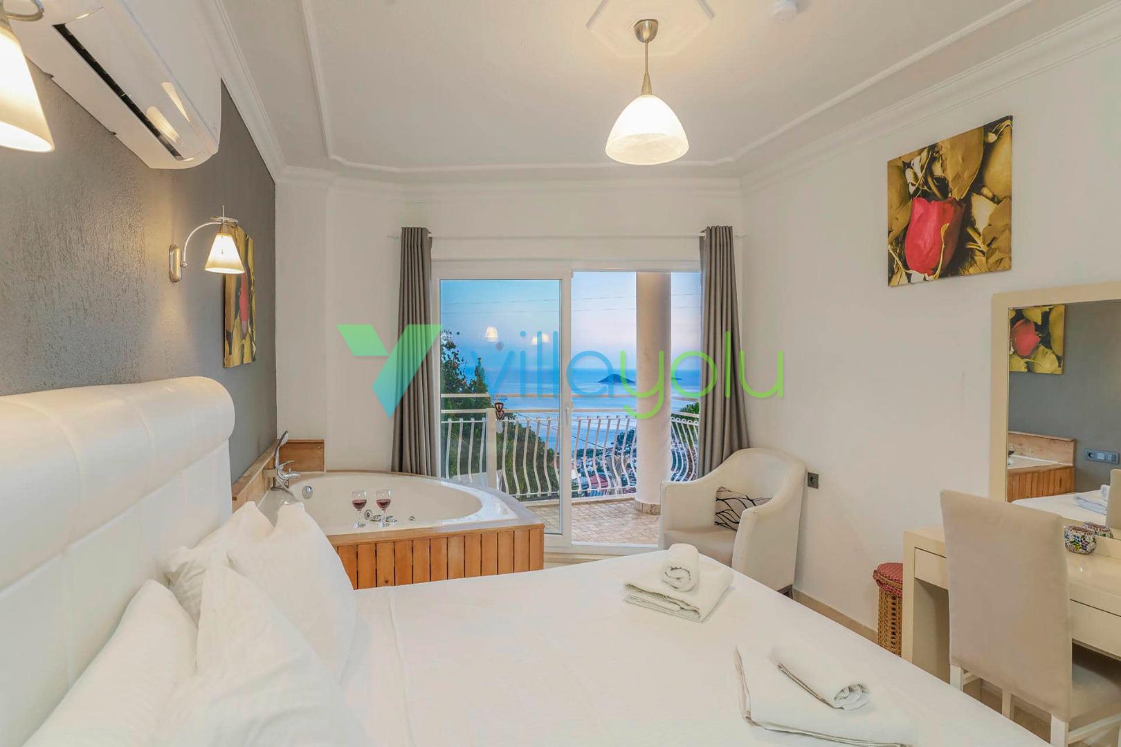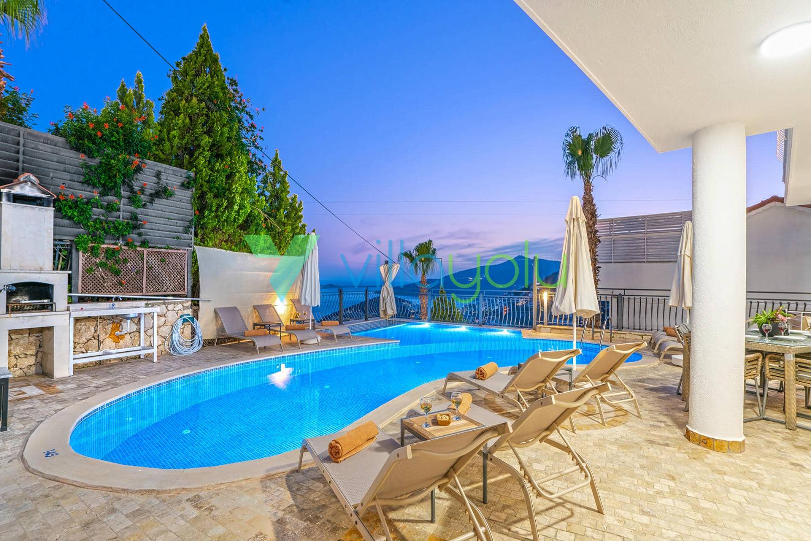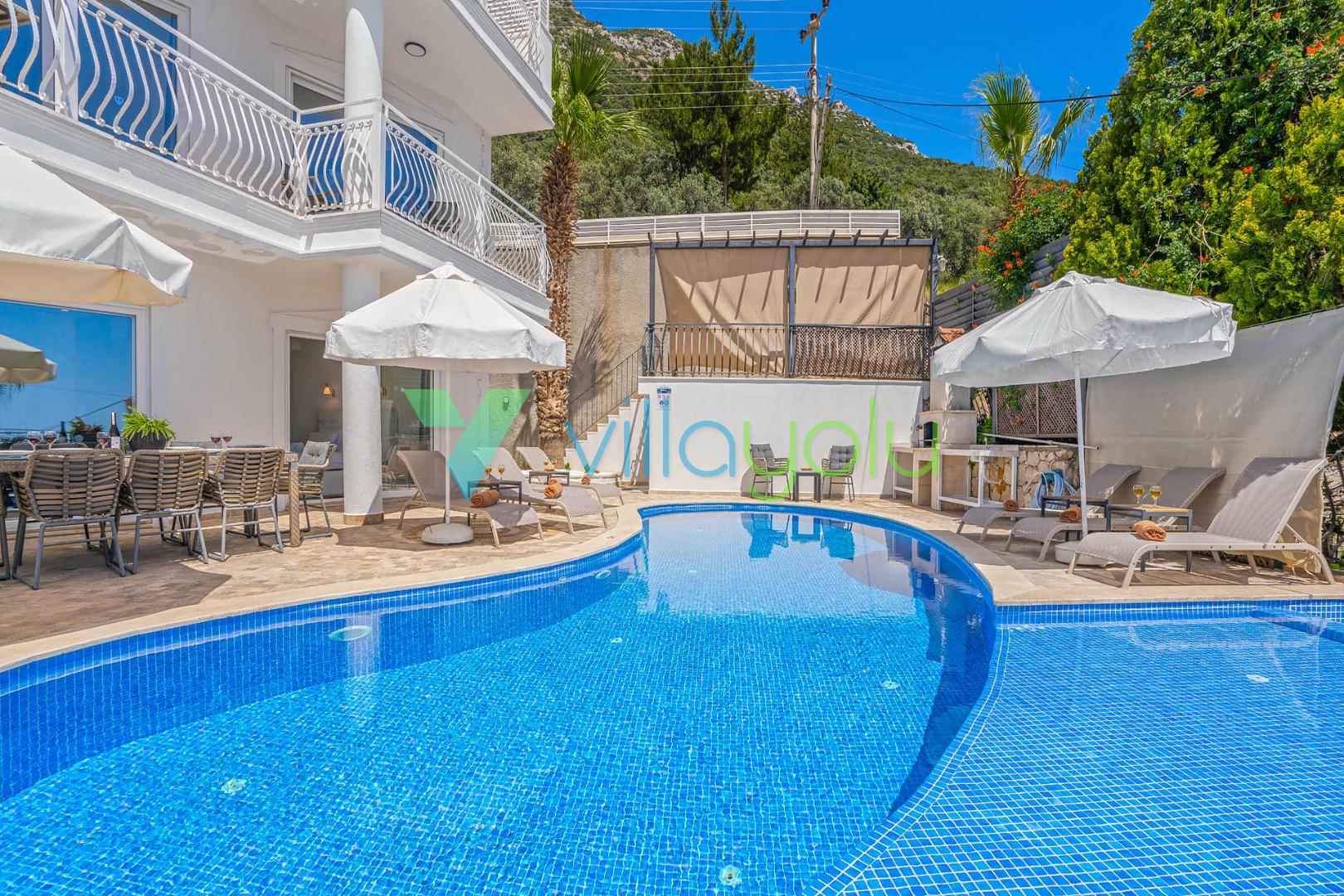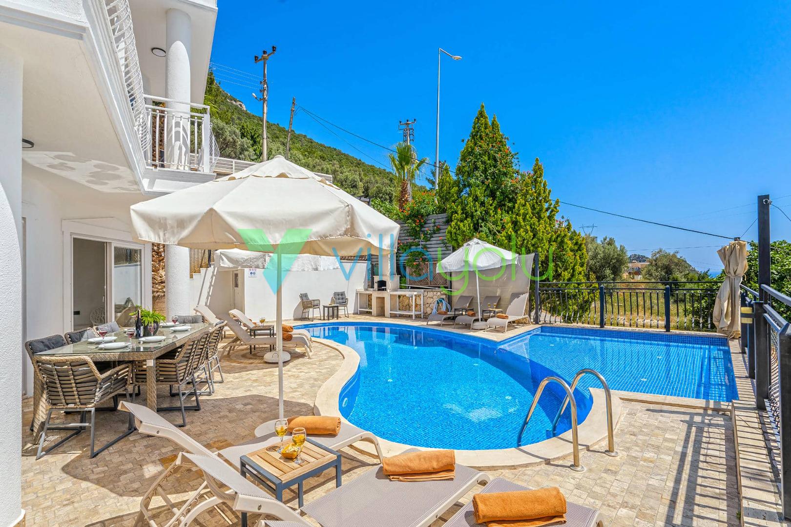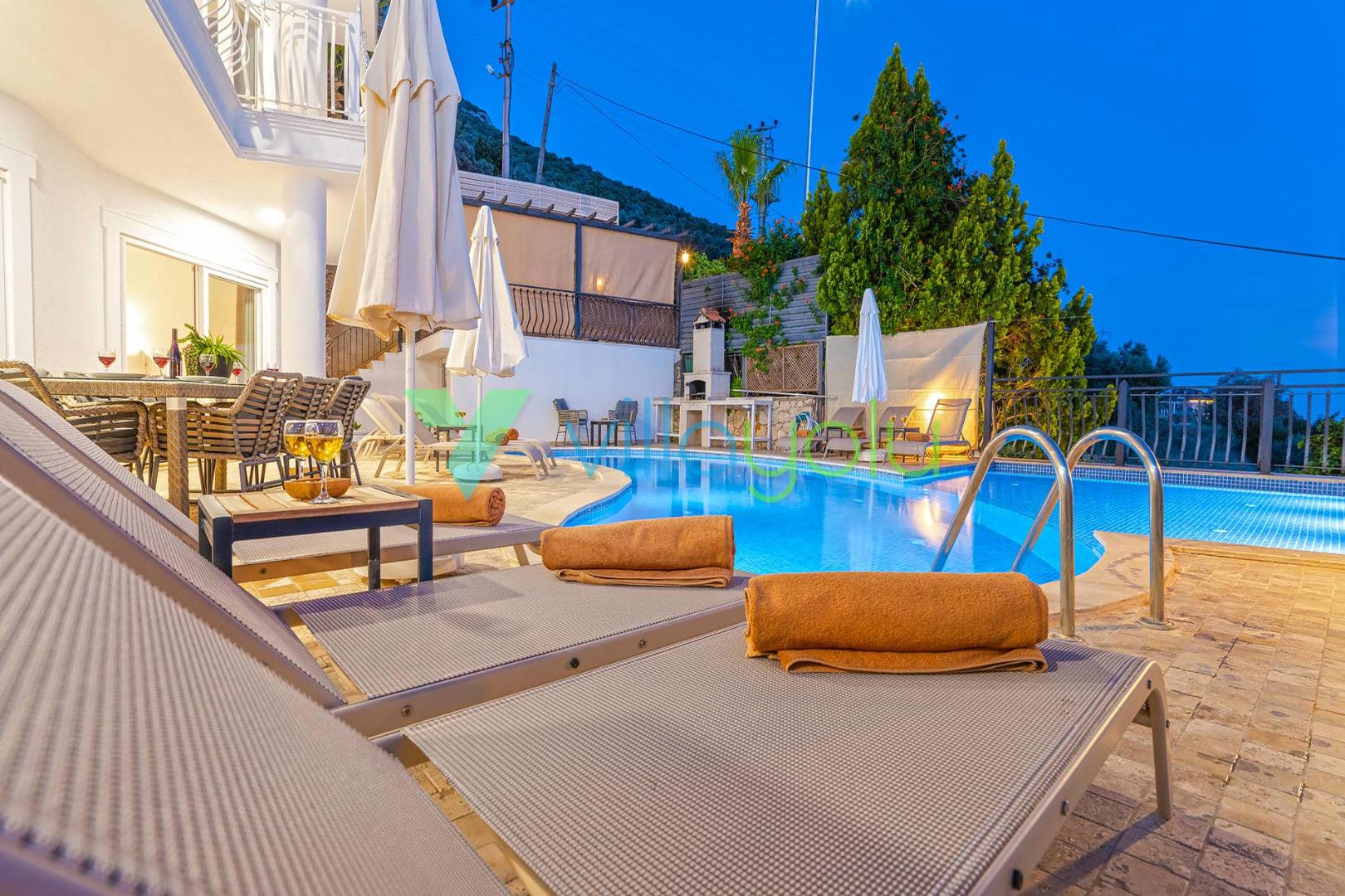 Villa Beyaz, Kalkan Kızıltaş'ta bulunan 5 yatak odalı 10 kişilik deniz manzaralı villamızdır.Villamızın ana yatak odasında kapalı havuz,teras katındaki odasında ise jakuzi bulunmaktadır. Havuza entegre geniş bir çocuk havuzu bulunan villamız çocuklu aileler için uygun bir seçenektir.Kalkan merkeze çok yakın konumda bulunan villamız,plajlara araçla 5 dk mesafededir.Geniş aile ve arkadaş grupları için harika bir seçimdir.