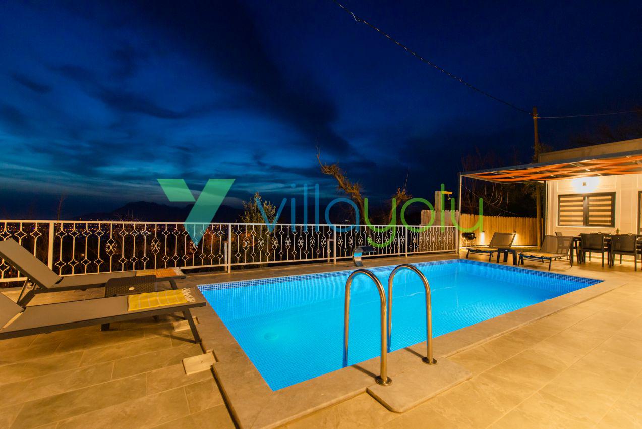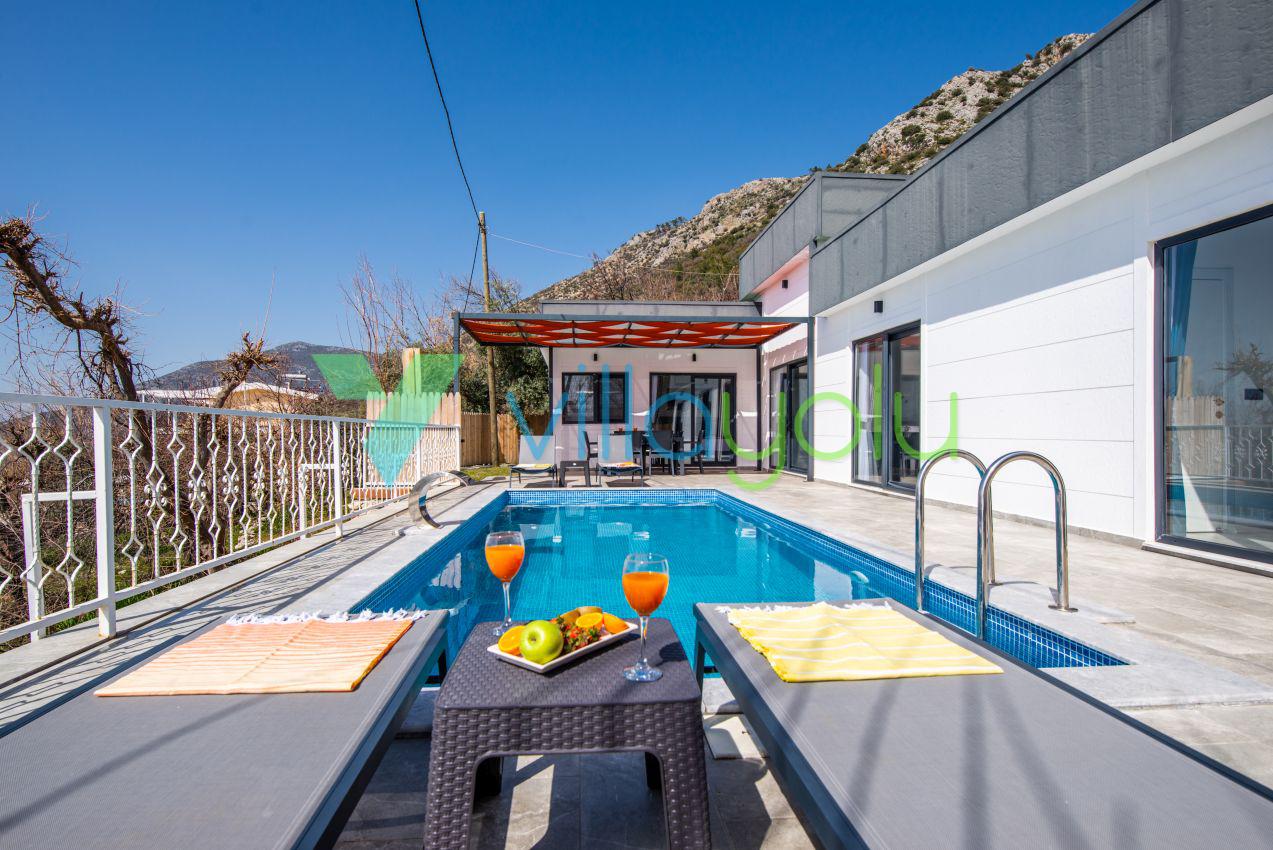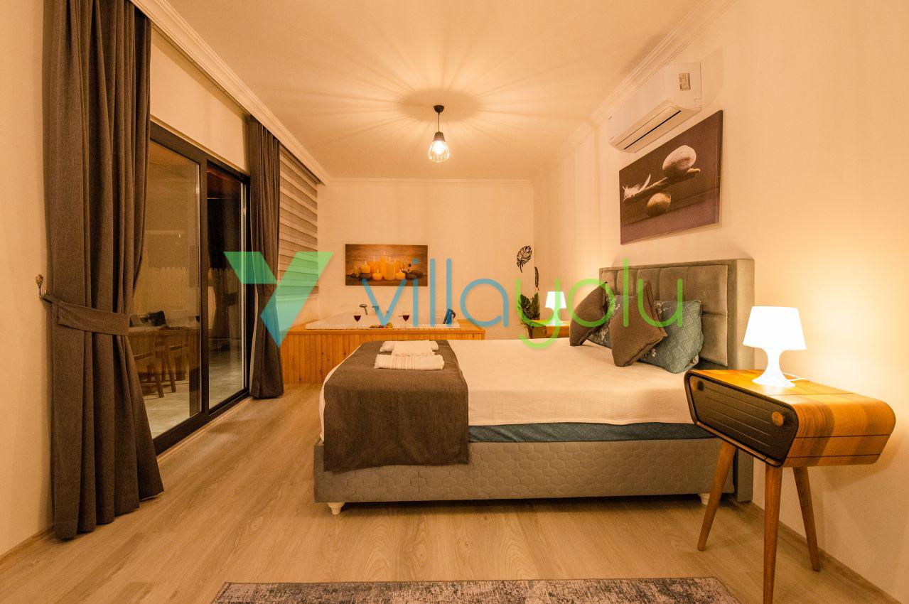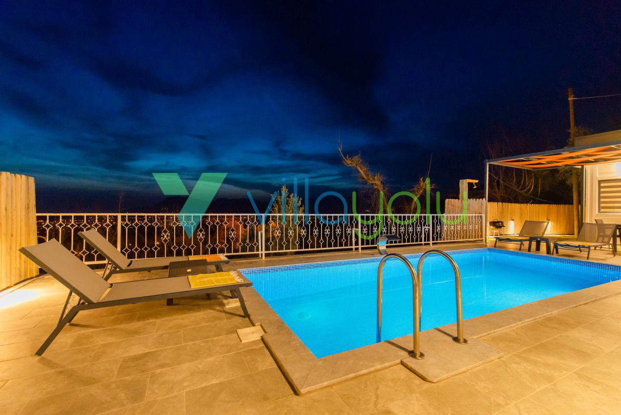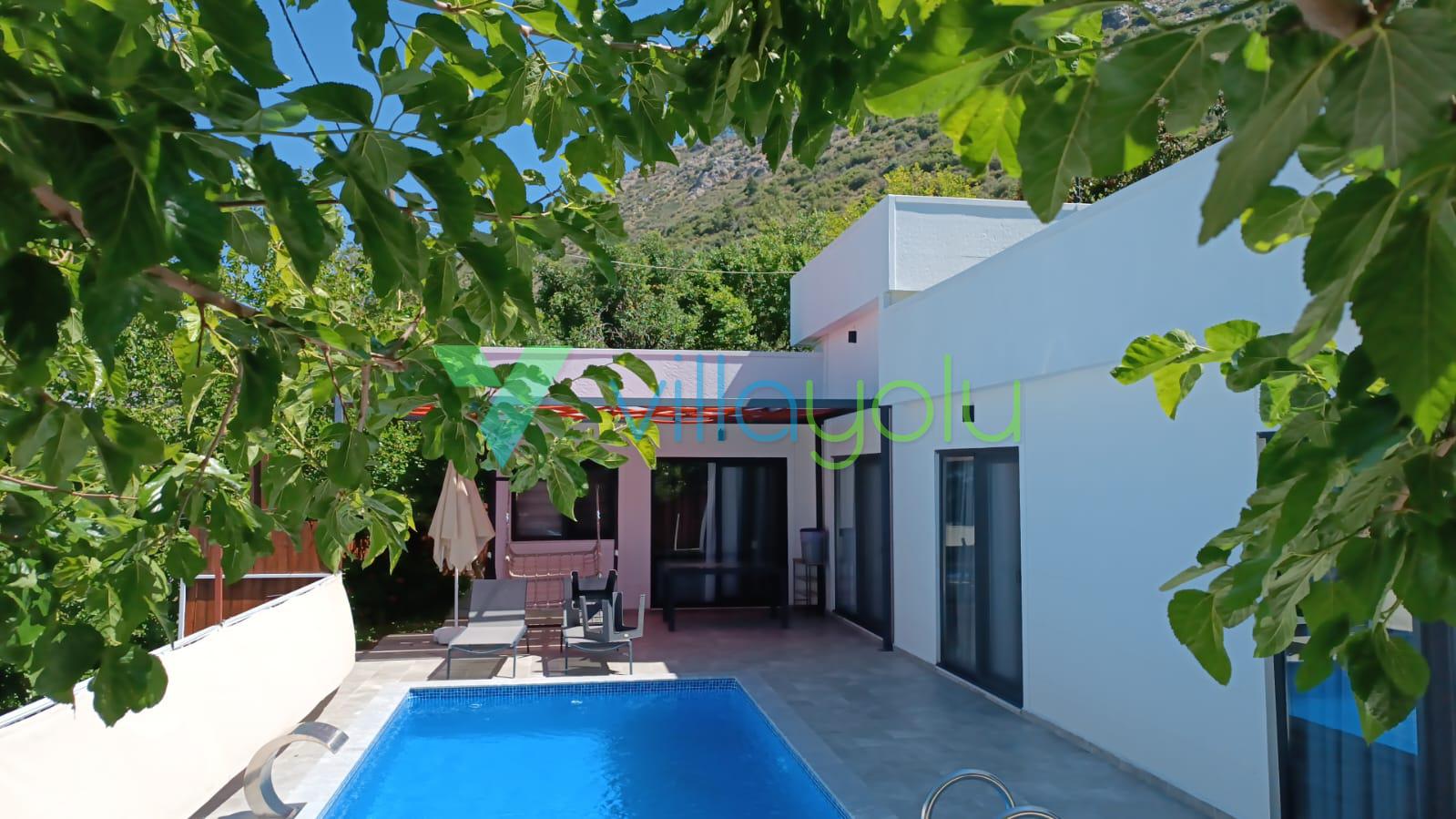 Kalkan Üzümlü mevkisinde 2 yatak odası 4 kişi kapasiteli geniş havuz ve bahçeli havuz alanı korunaklı villadır.