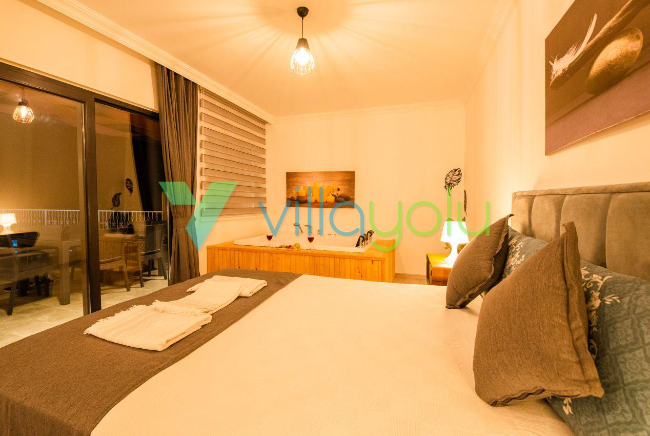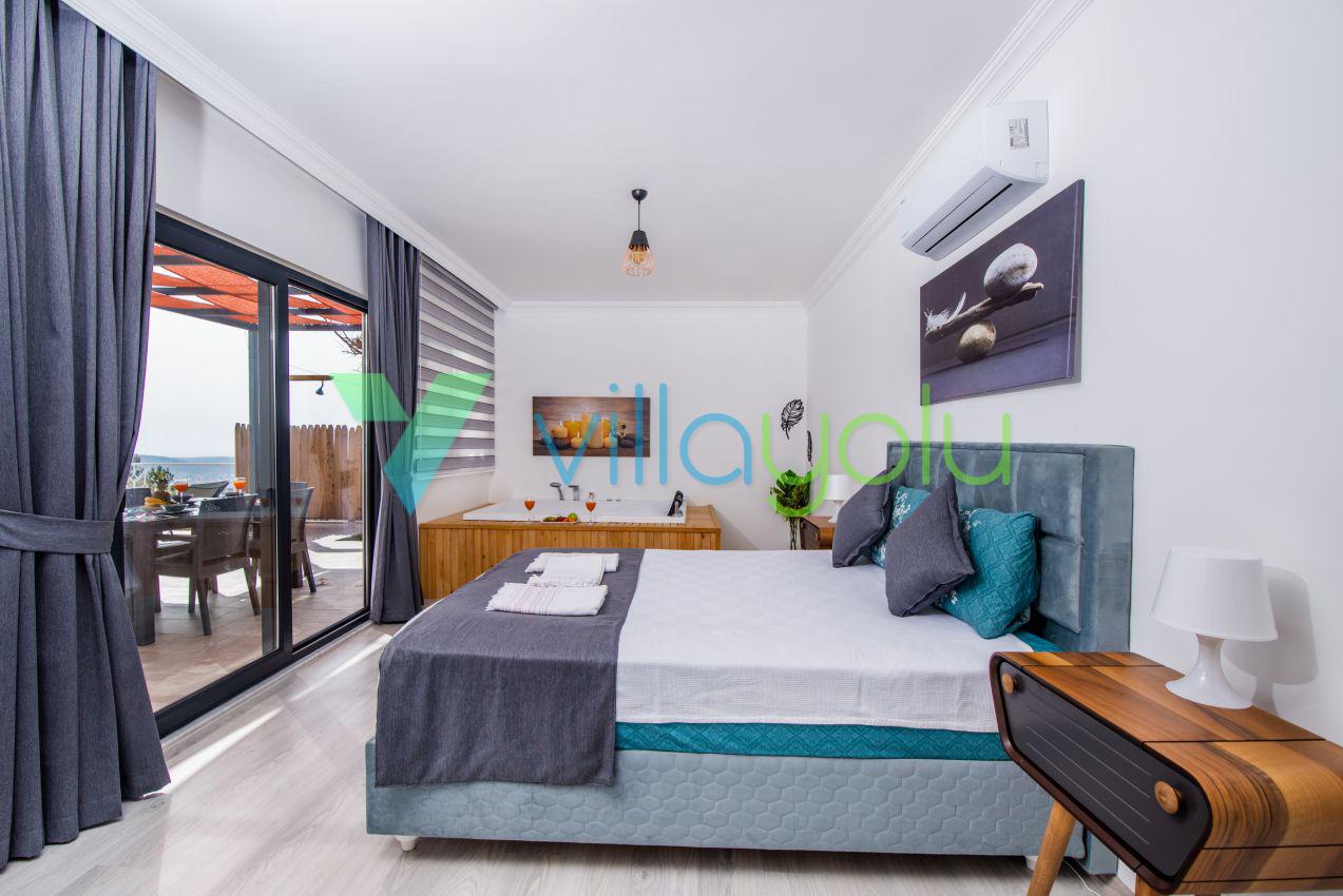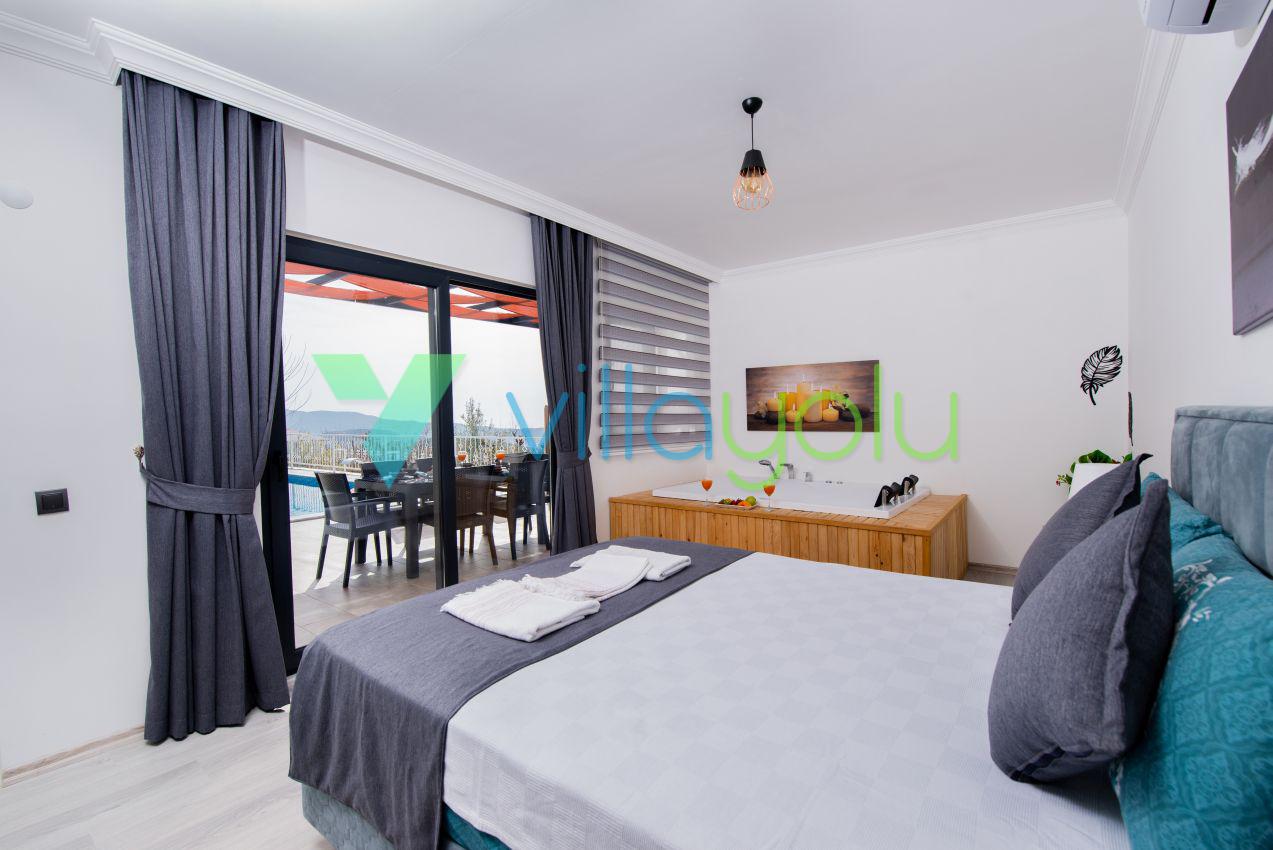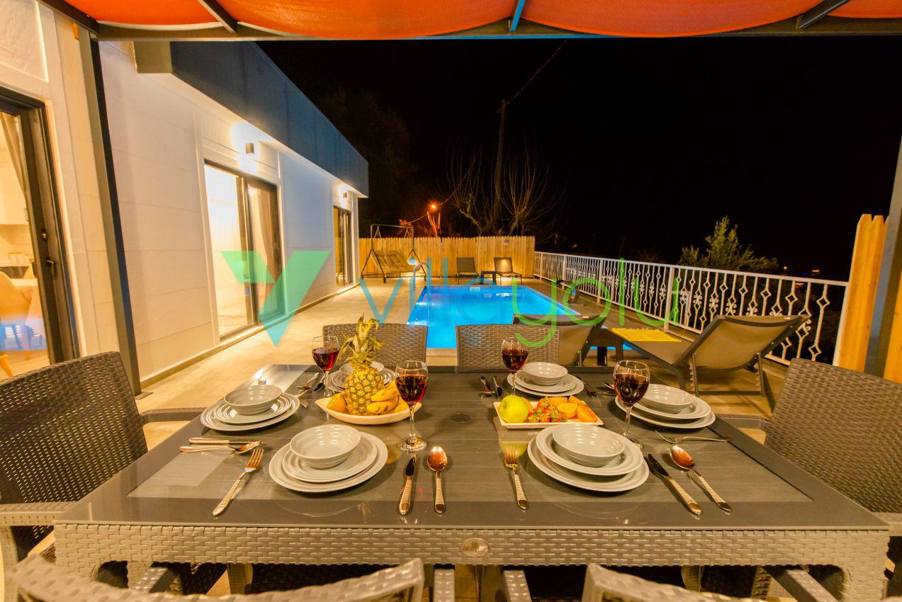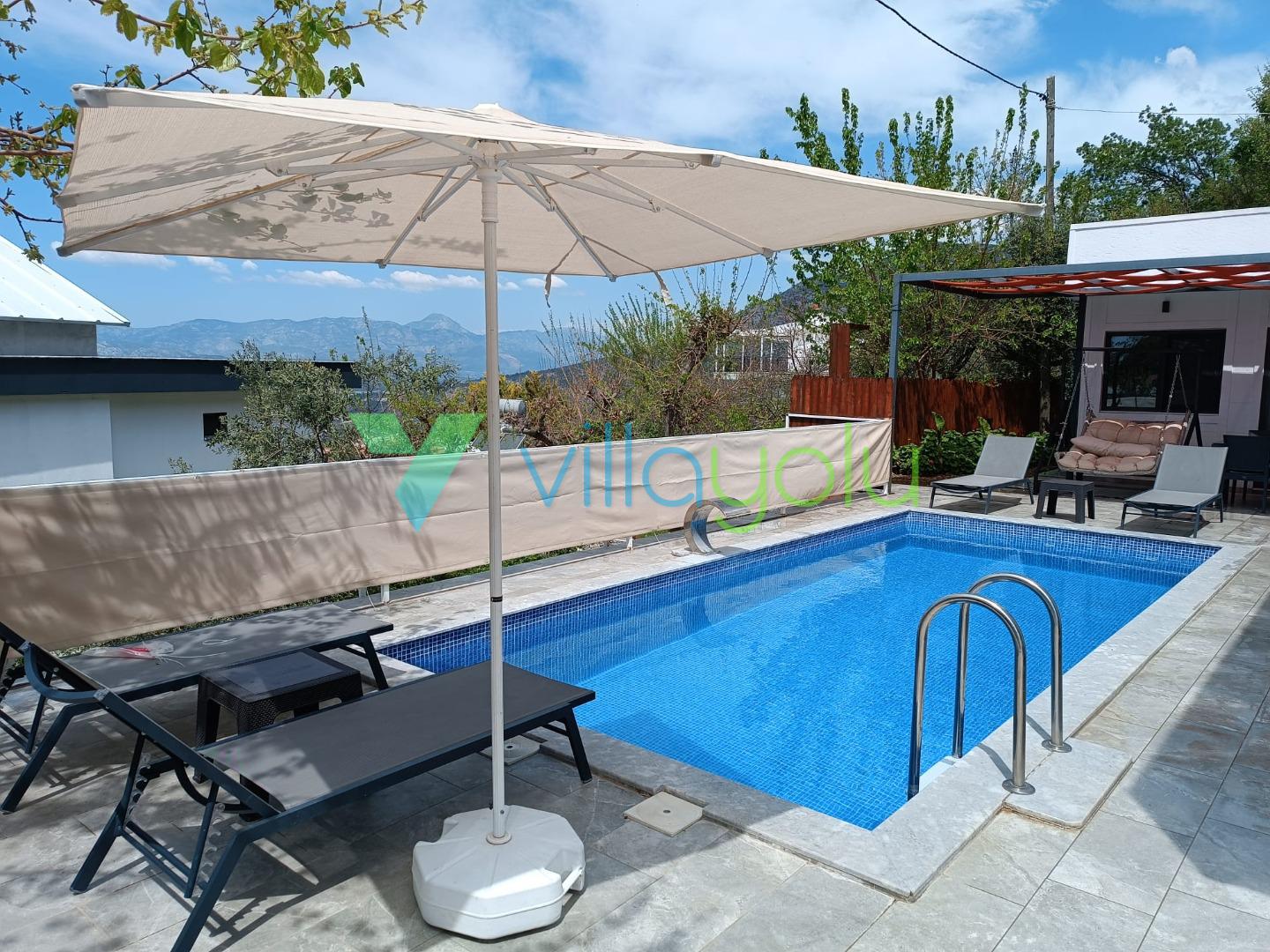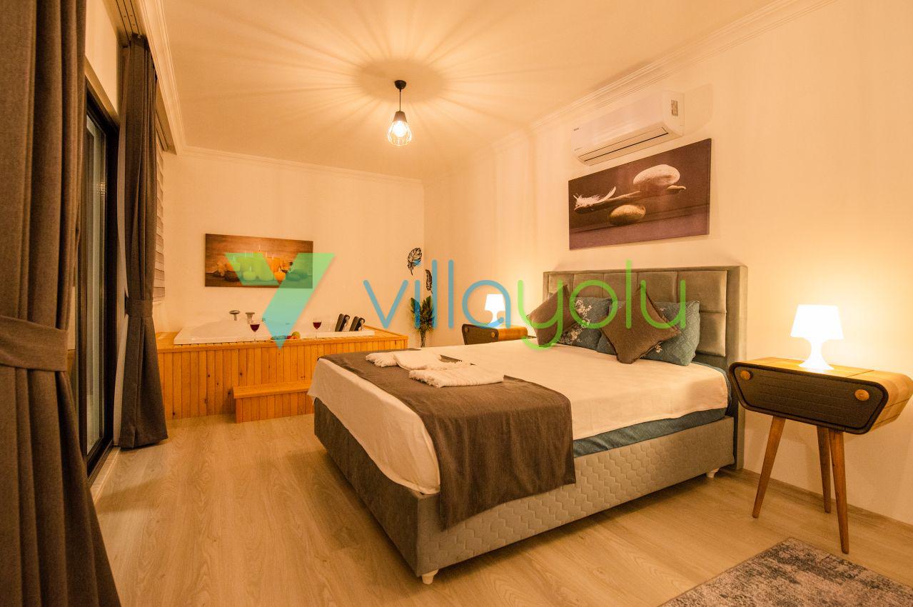 Kalkan Üzümlü mevkisinde 2 yatak odası 4 kişi kapasiteli geniş havuz ve bahçeli havuz alanı korunaklı villadır.