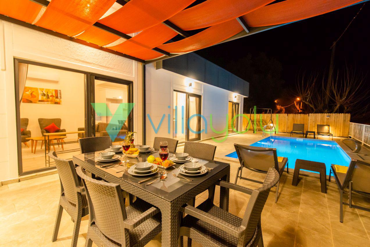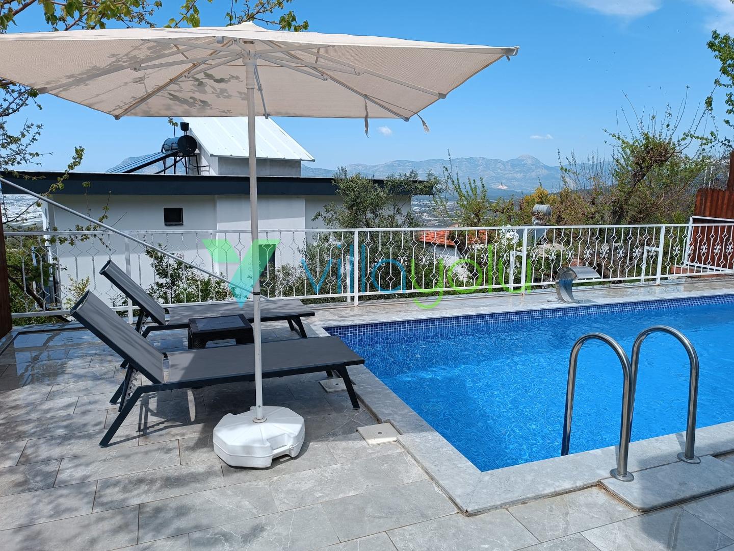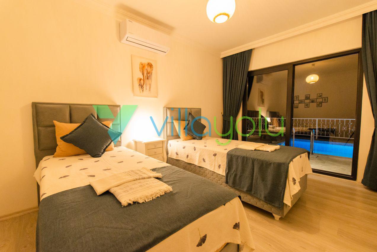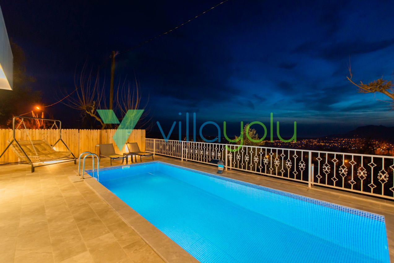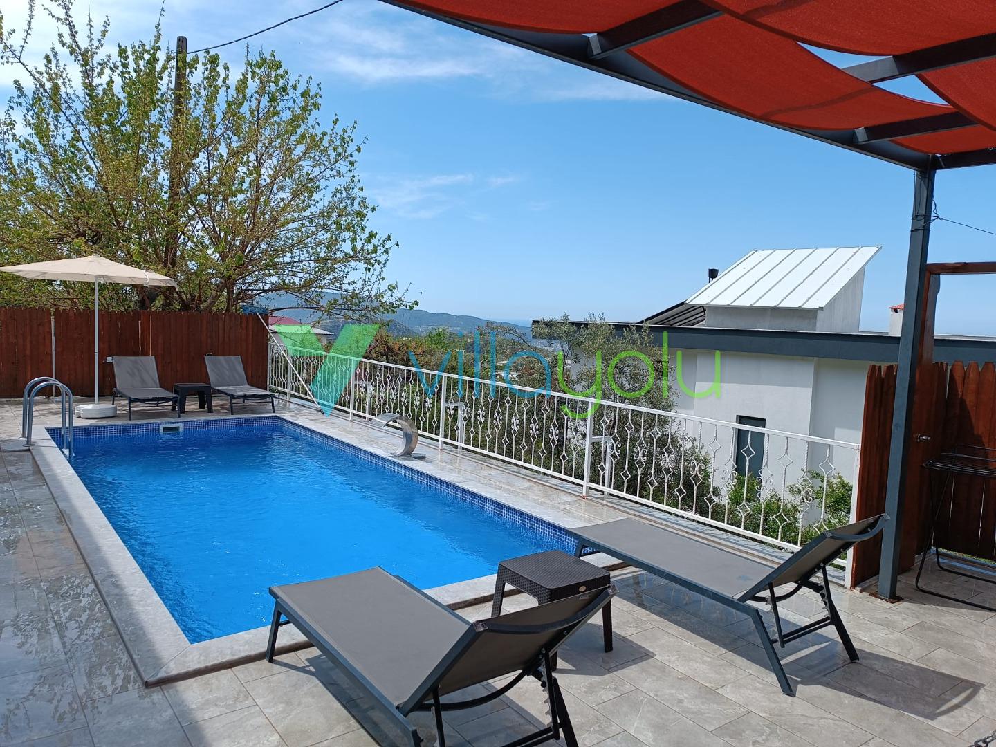 Kalkan Üzümlü mevkisinde 2 yatak odası 4 kişi kapasiteli geniş havuz ve bahçeli havuz alanı korunaklı villadır.