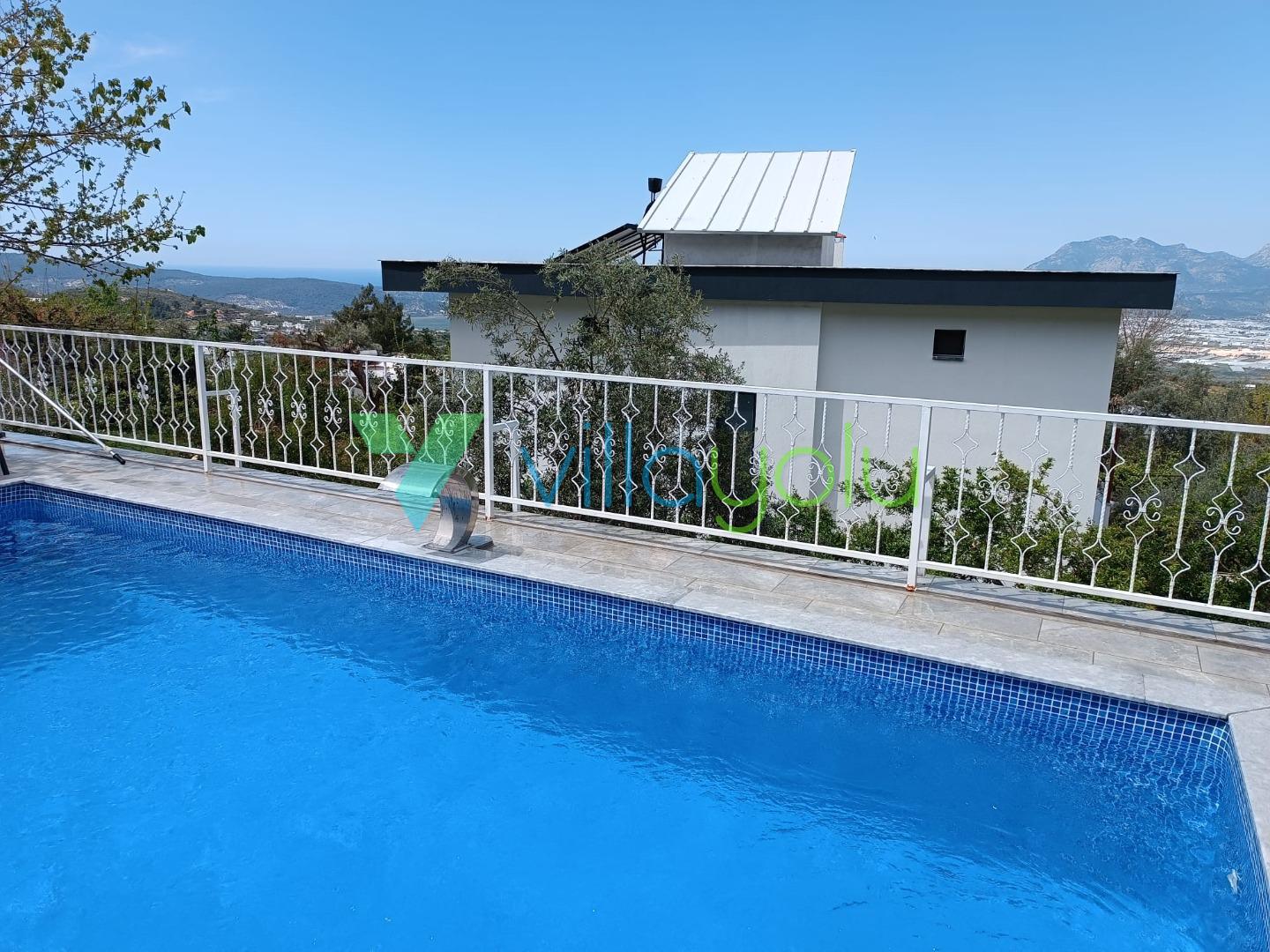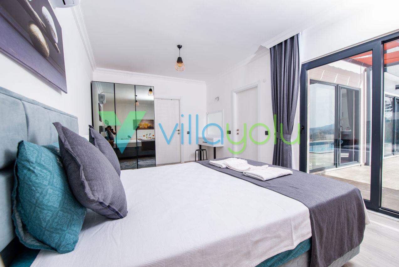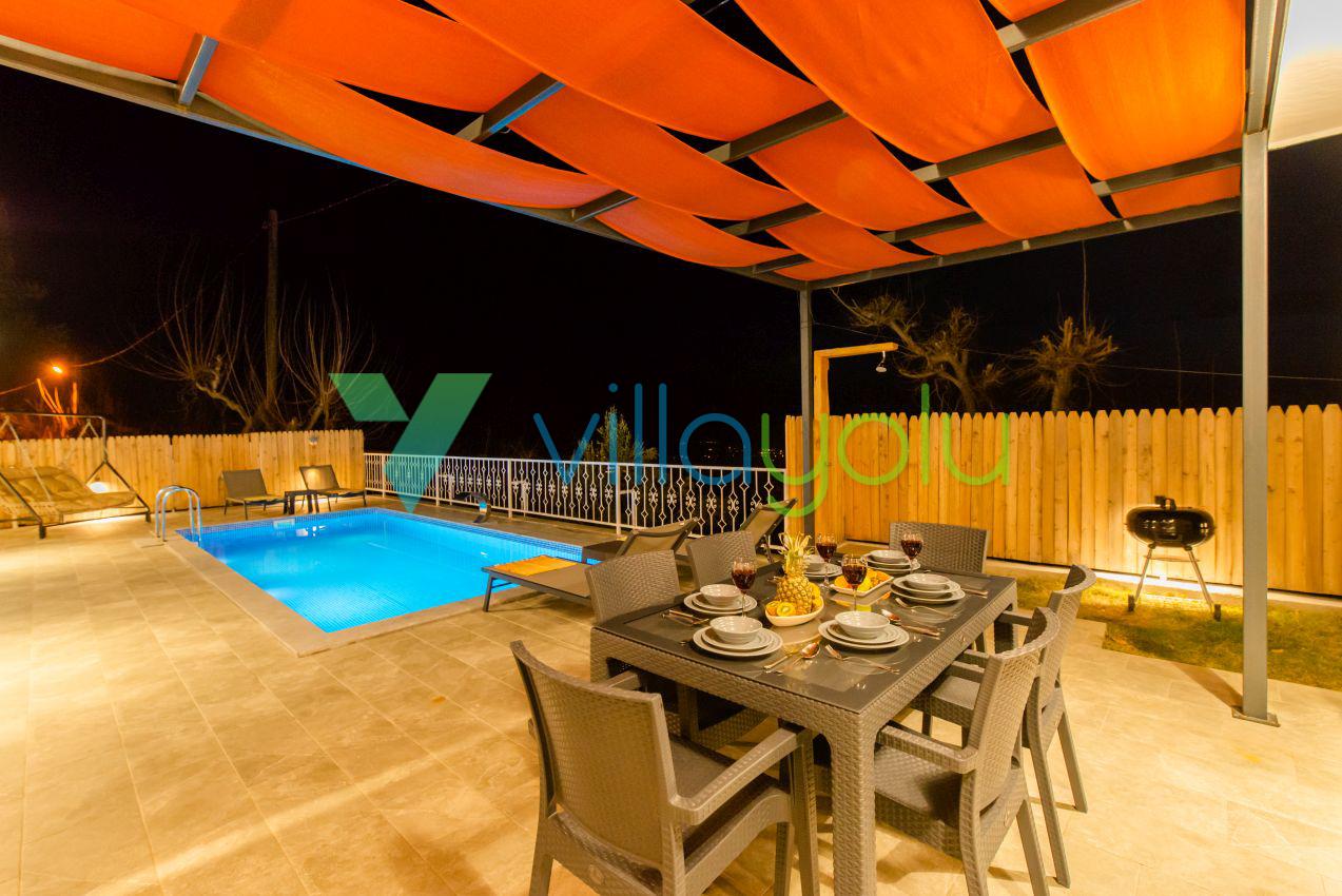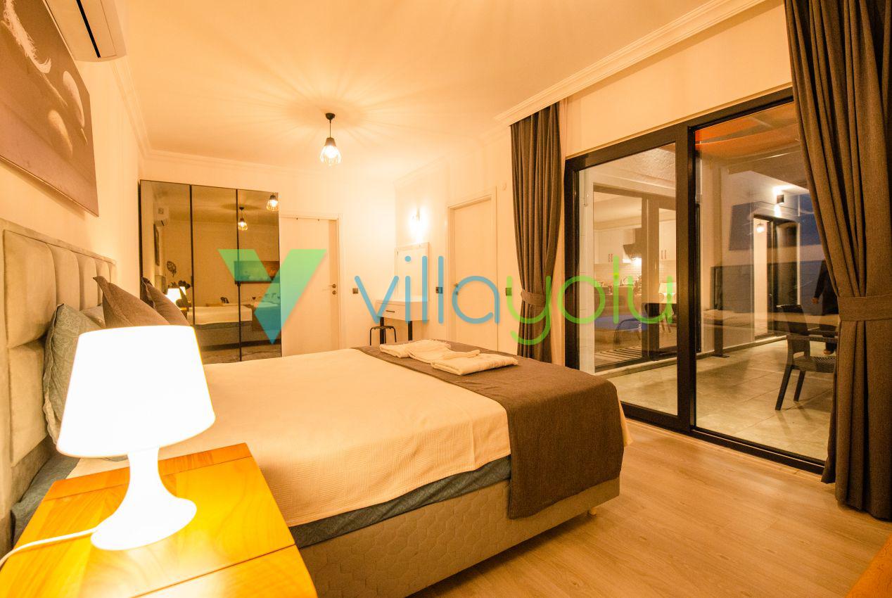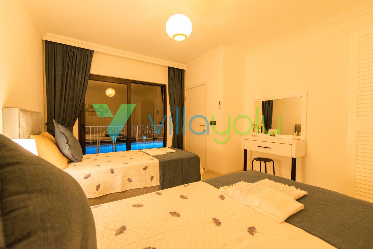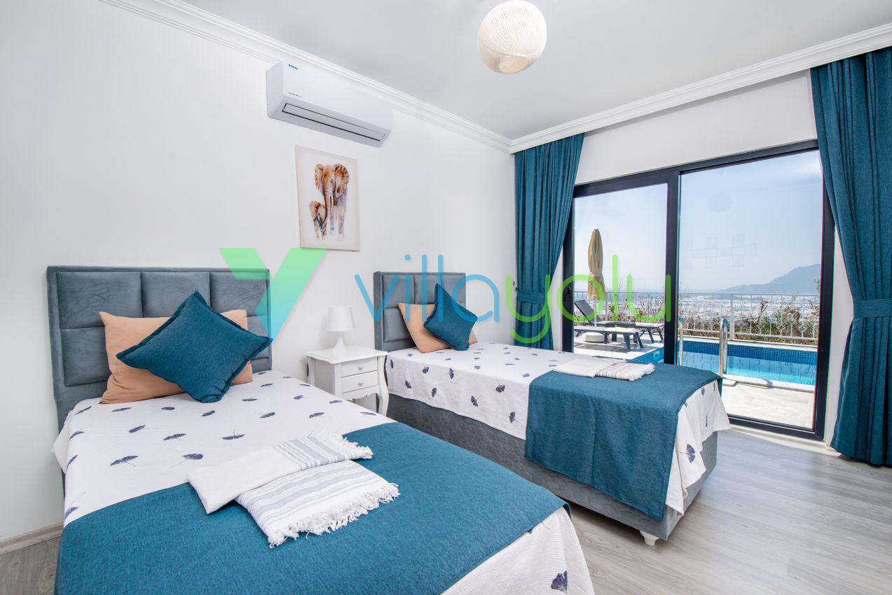 Kalkan Üzümlü mevkisinde 2 yatak odası 4 kişi kapasiteli geniş havuz ve bahçeli havuz alanı korunaklı villadır.