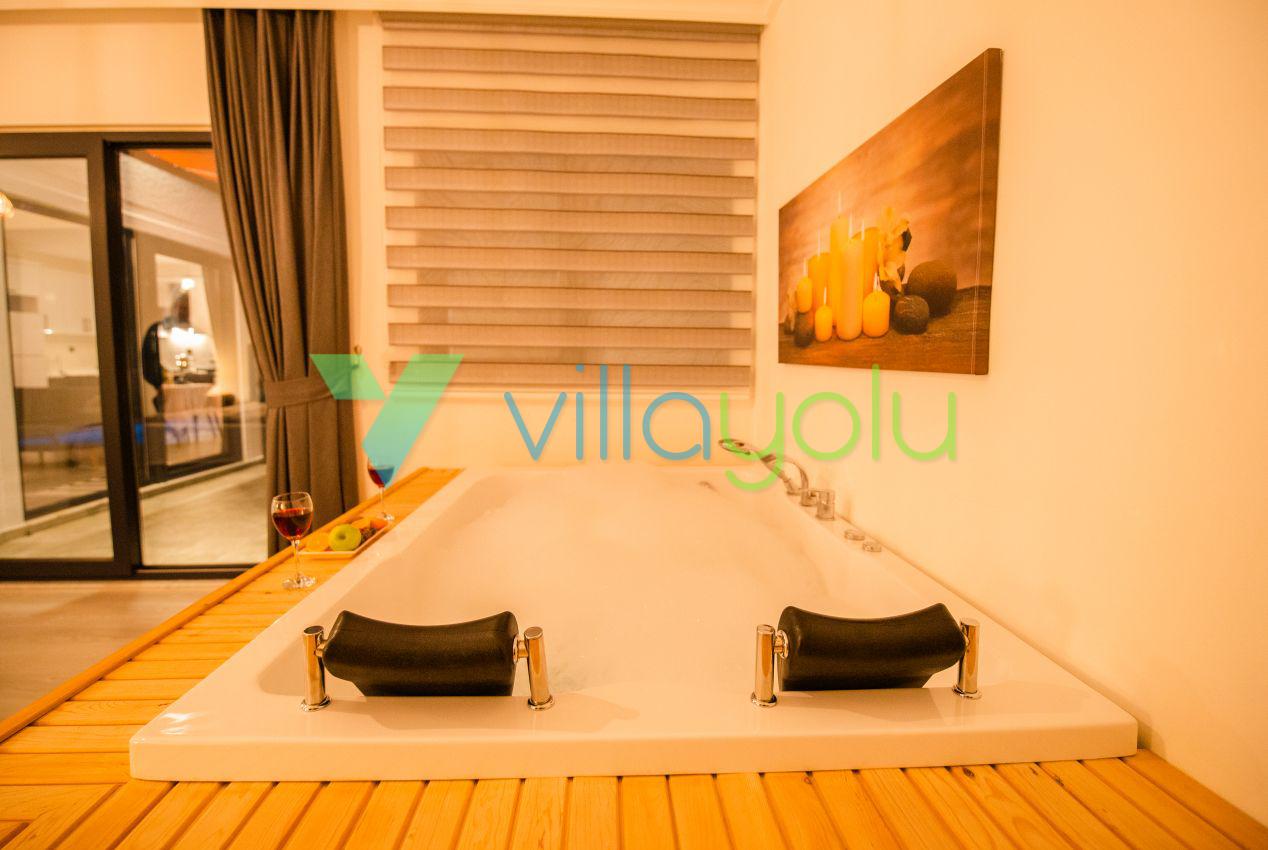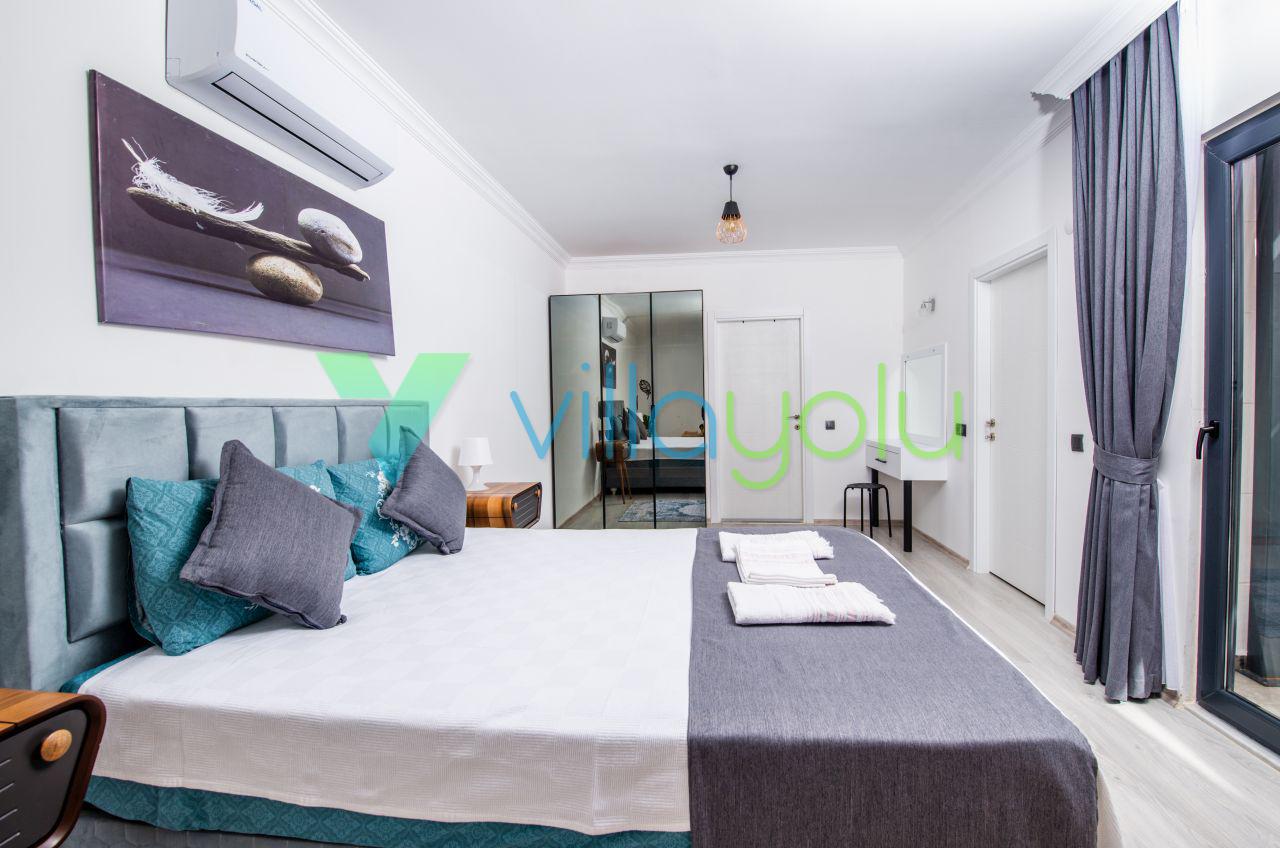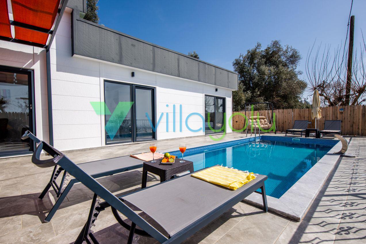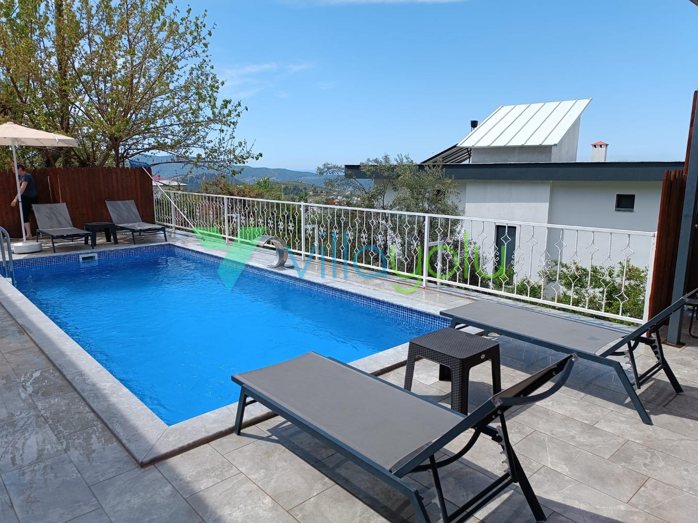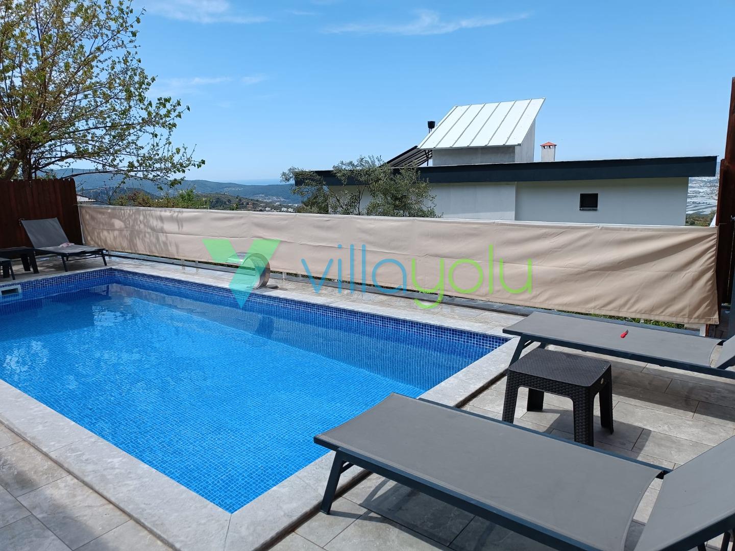 Kalkan Üzümlü mevkisinde 2 yatak odası 4 kişi kapasiteli geniş havuz ve bahçeli havuz alanı korunaklı villadır.