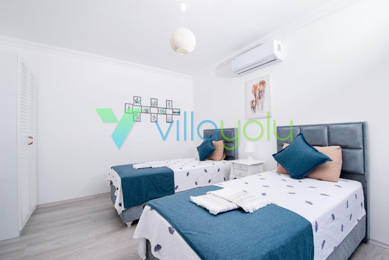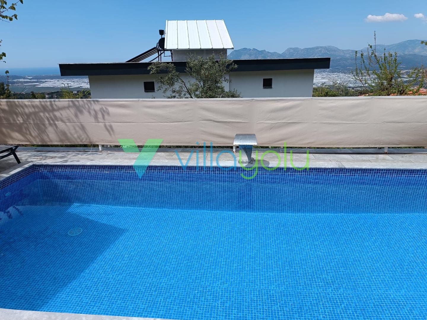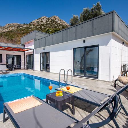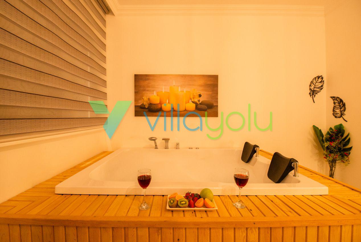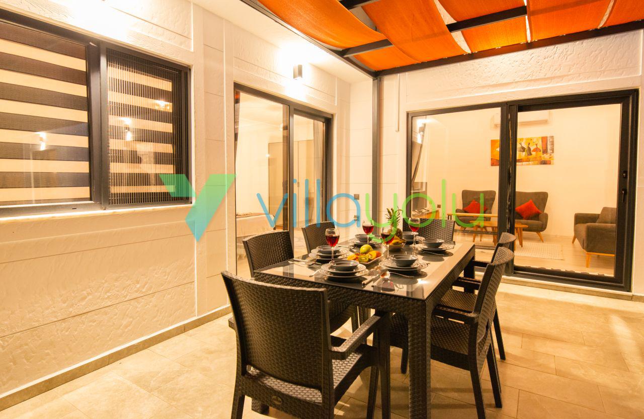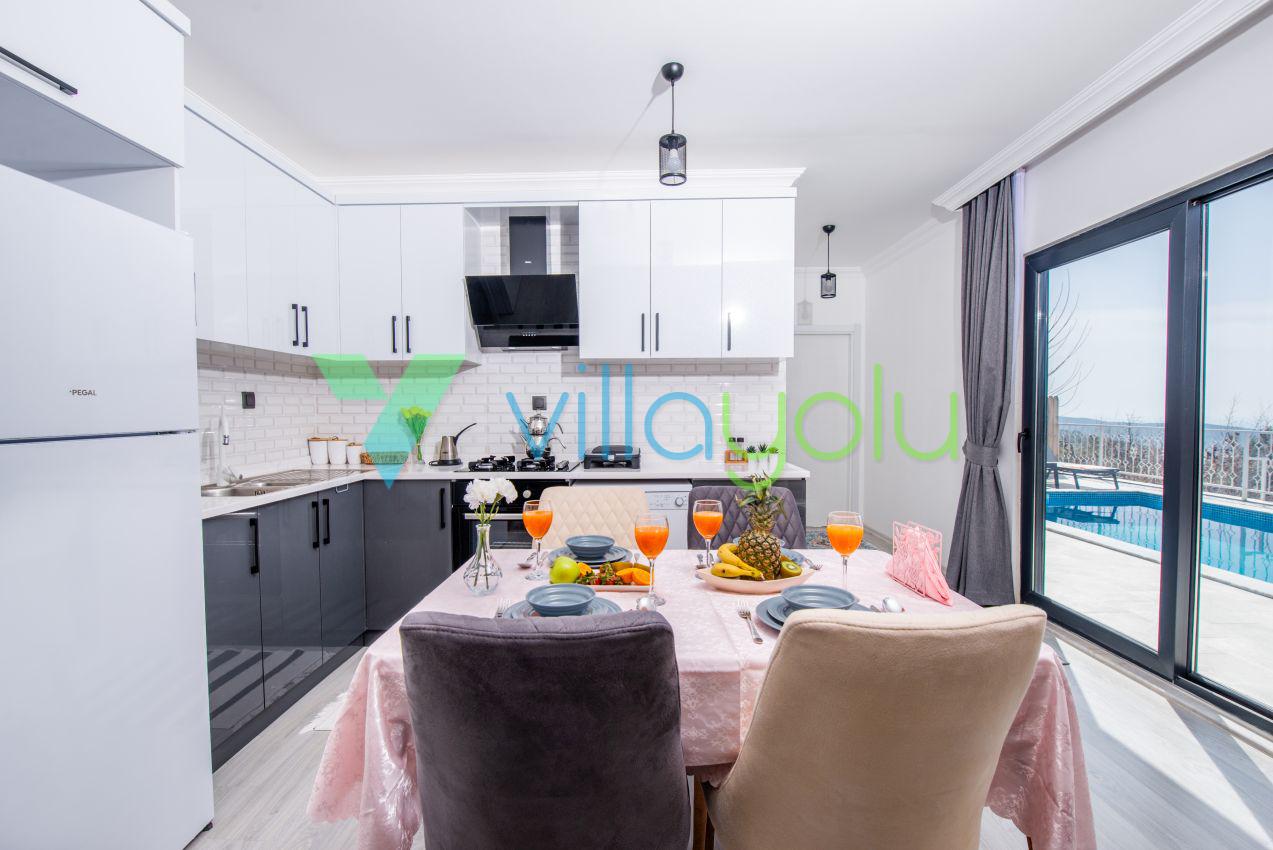 Kalkan Üzümlü mevkisinde 2 yatak odası 4 kişi kapasiteli geniş havuz ve bahçeli havuz alanı korunaklı villadır.