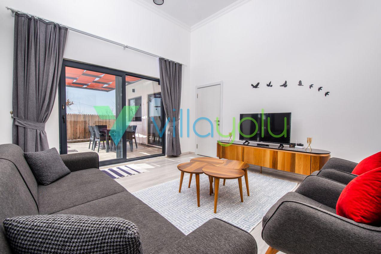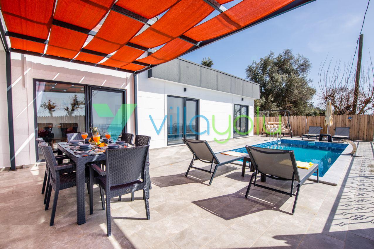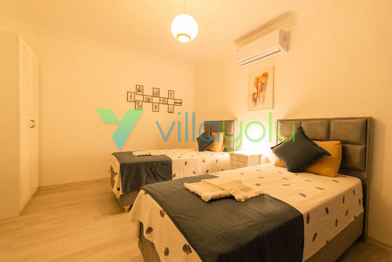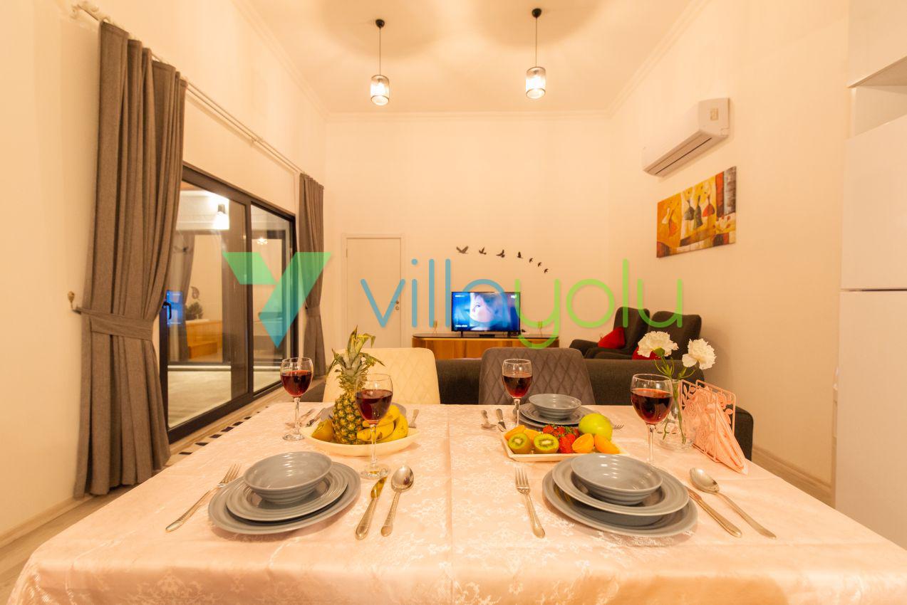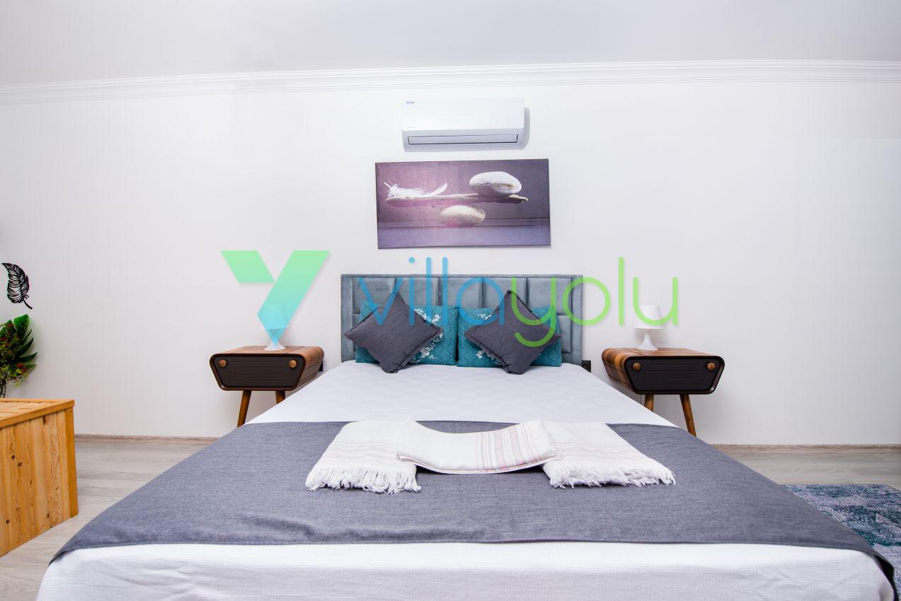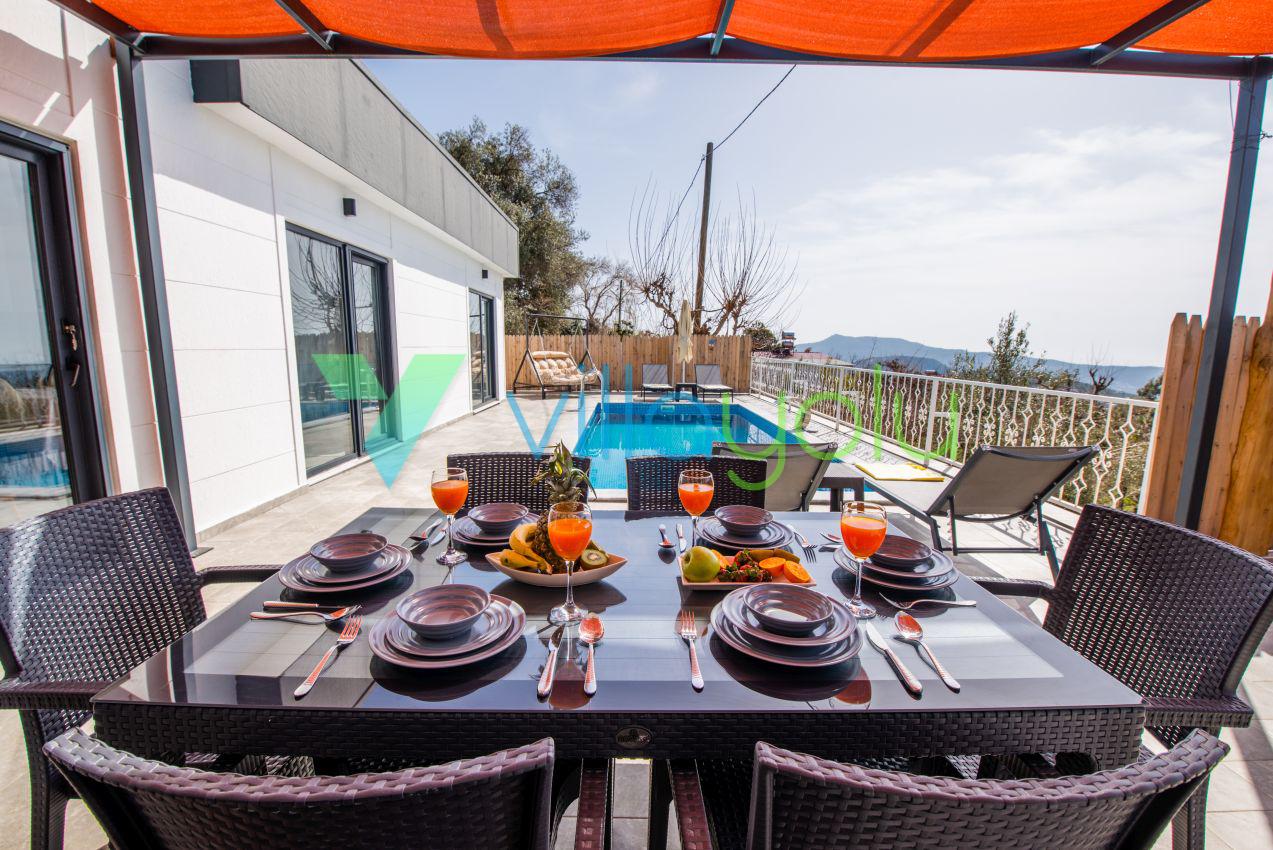 Kalkan Üzümlü mevkisinde 2 yatak odası 4 kişi kapasiteli geniş havuz ve bahçeli havuz alanı korunaklı villadır.