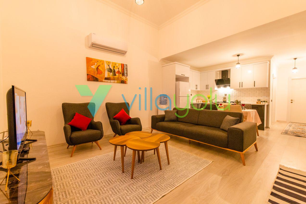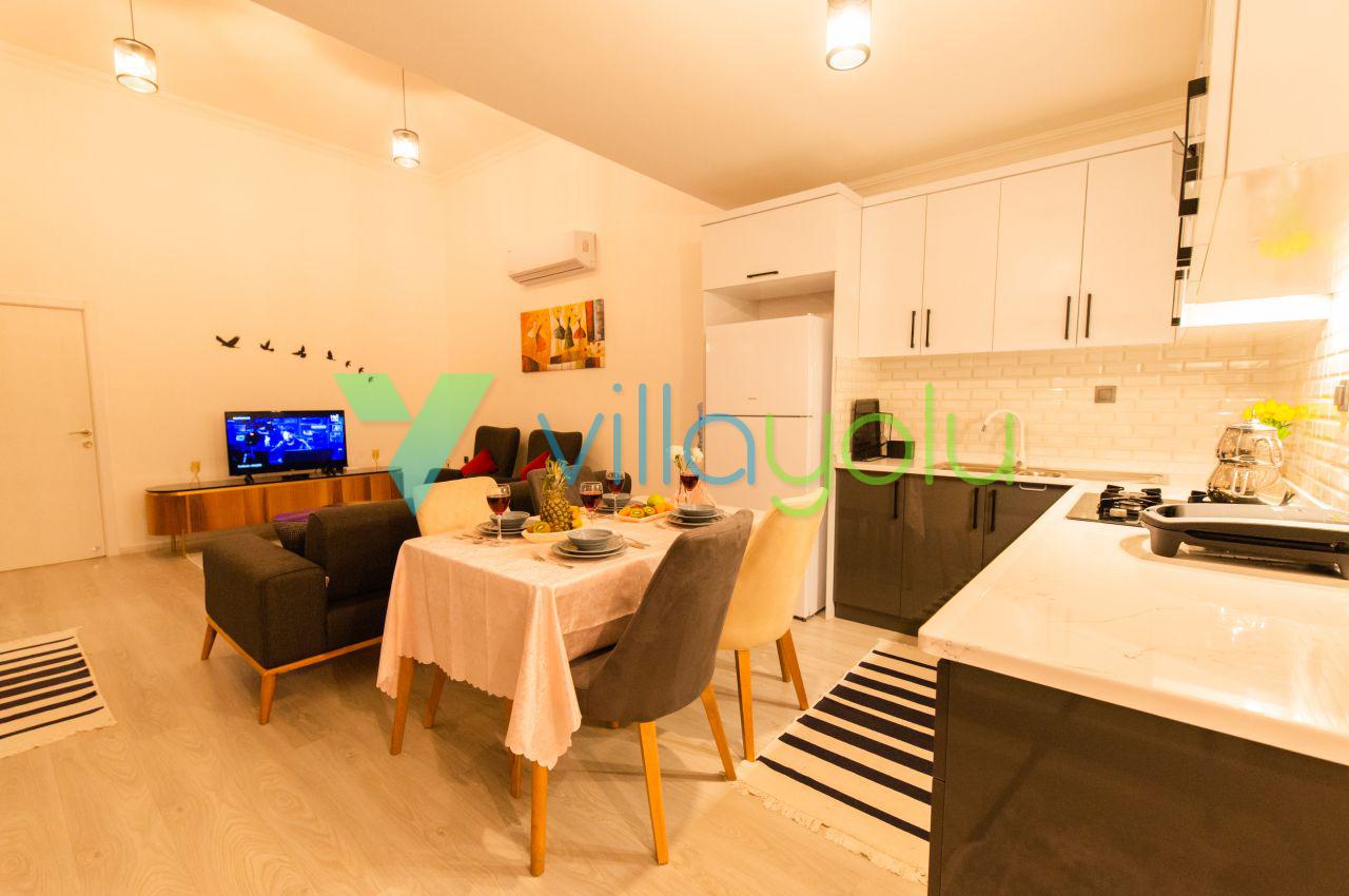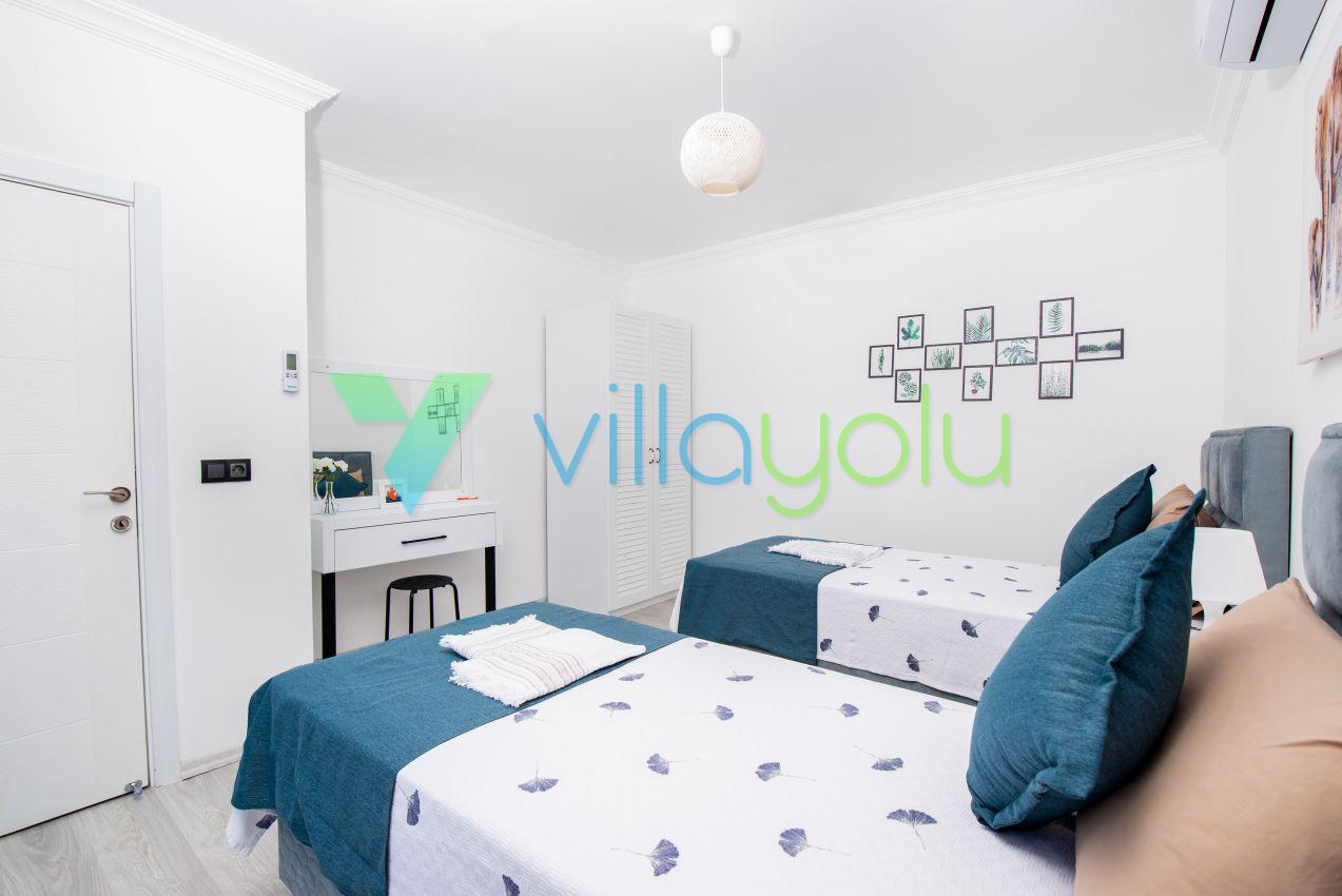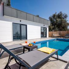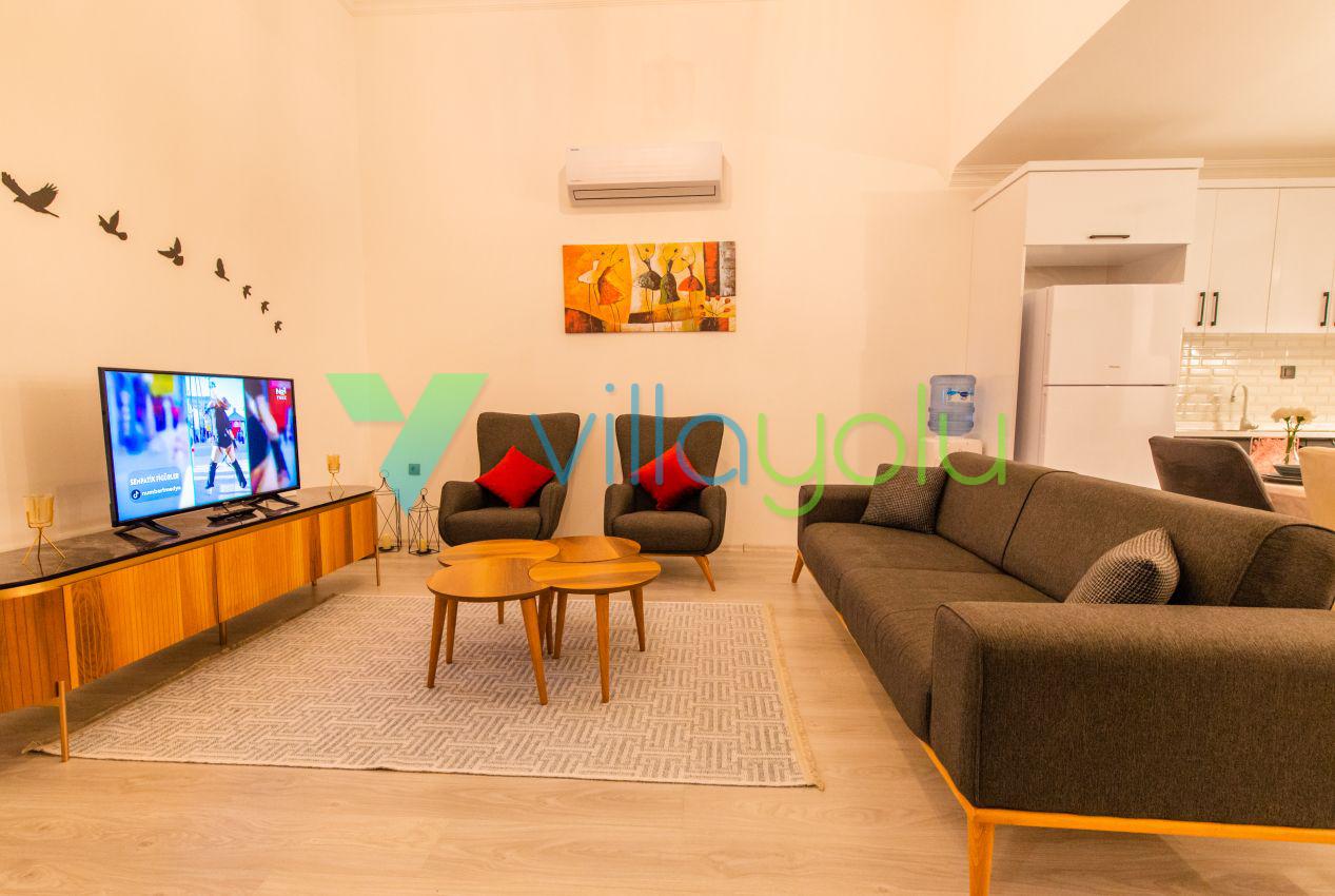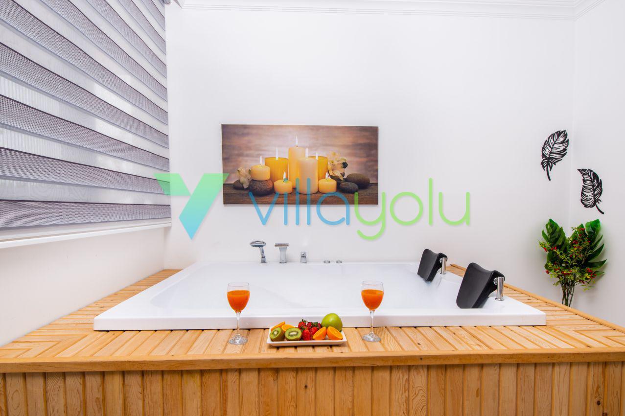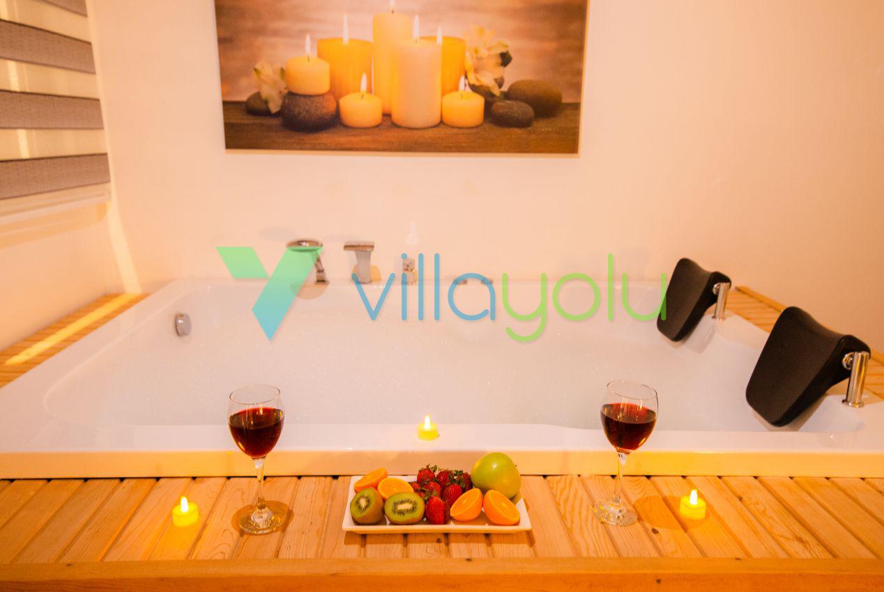 Kalkan Üzümlü mevkisinde 2 yatak odası 4 kişi kapasiteli geniş havuz ve bahçeli havuz alanı korunaklı villadır.