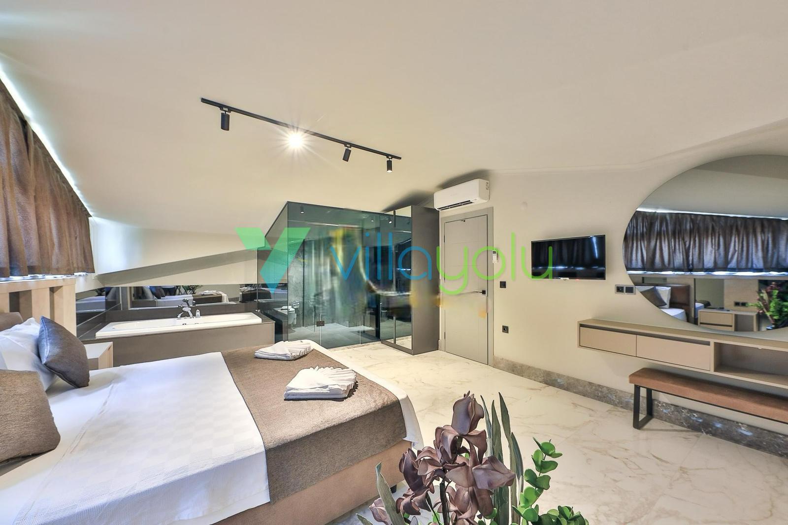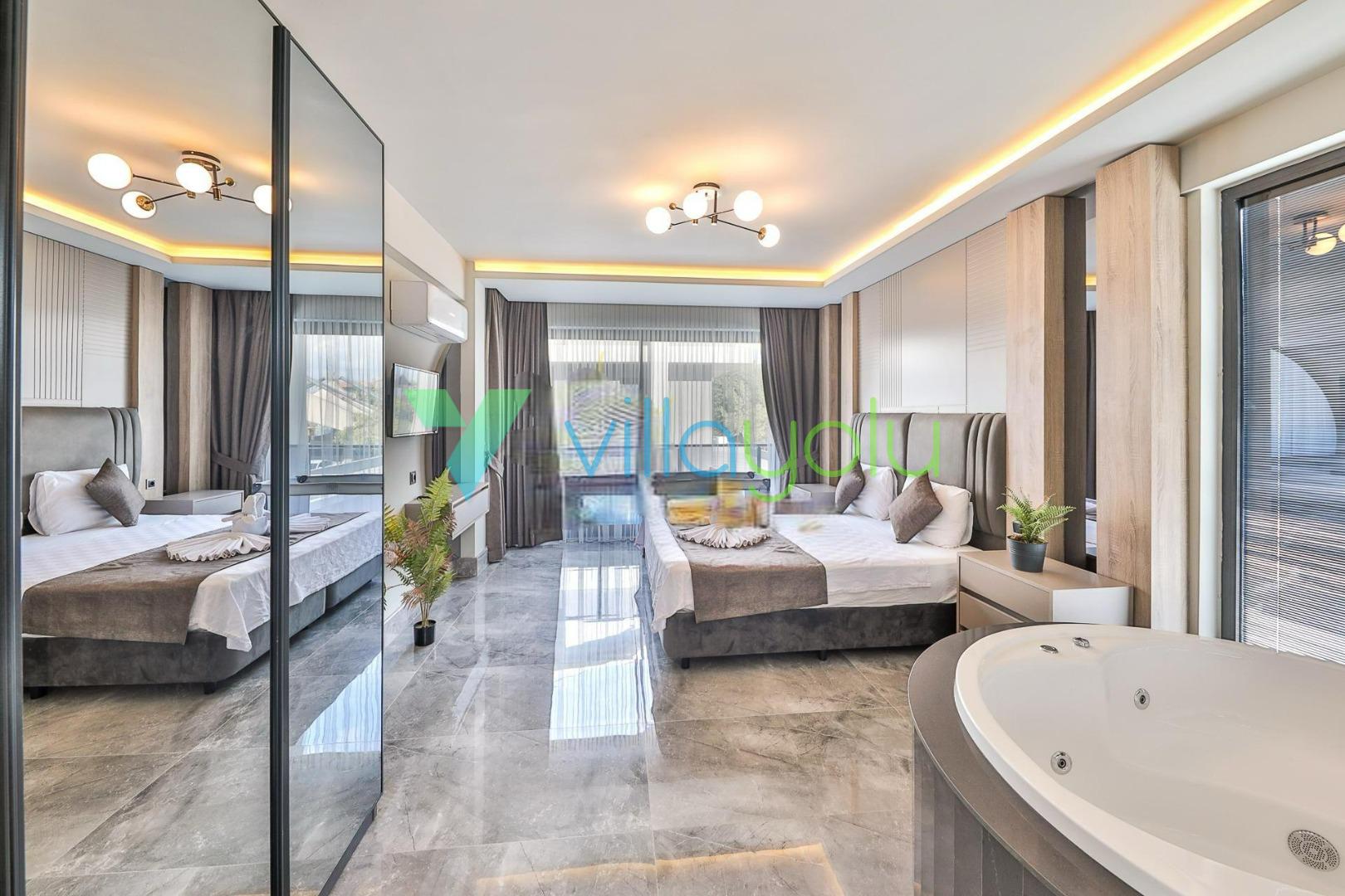 Villa Escalade,Fethiye'nin Akarca mevkisinde 4 yatak odası 8 kişi kapasitelidir. 3 yatak odasında çift kişilik yatak 1 yatak odasında 2 tekli yatak bulunmaktadır.2 yatak odasında jakuzi bulunmaktadır.Villamızda ısıtmalı kapalı havuz,hamam ve sauna bulunmaktadır.Modern ve lüks tasarıma sahip villamız son derece kaliteli eşyalarla döşenmiştir.