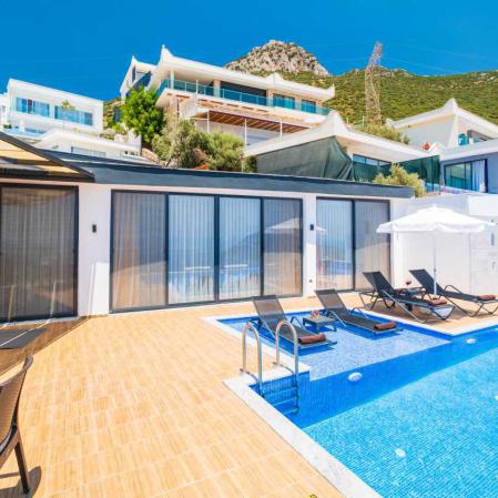 Villa Meri,Kalkan Merkeze 1,5km mesafede Akbel mevkisinde harika deniz manzaralı,2 yatak odası 5 kişilik tatil villasıdır.Çocuklu aileler için havuza entegre çocuk havuzu ve balayı çiftleri için yatak odasında jakuzi bulunmaktadır.Modern ve lüks tasarıma sahip villamız 2023 yapımıdır.